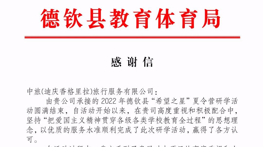 誠信經(jīng)營 優(yōu)質(zhì)服務(wù)?一封來自德欽縣教體局的感謝信!