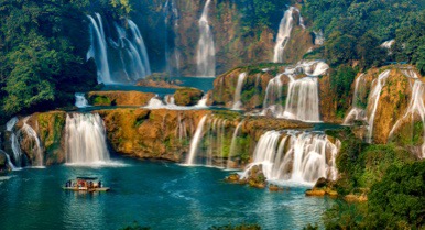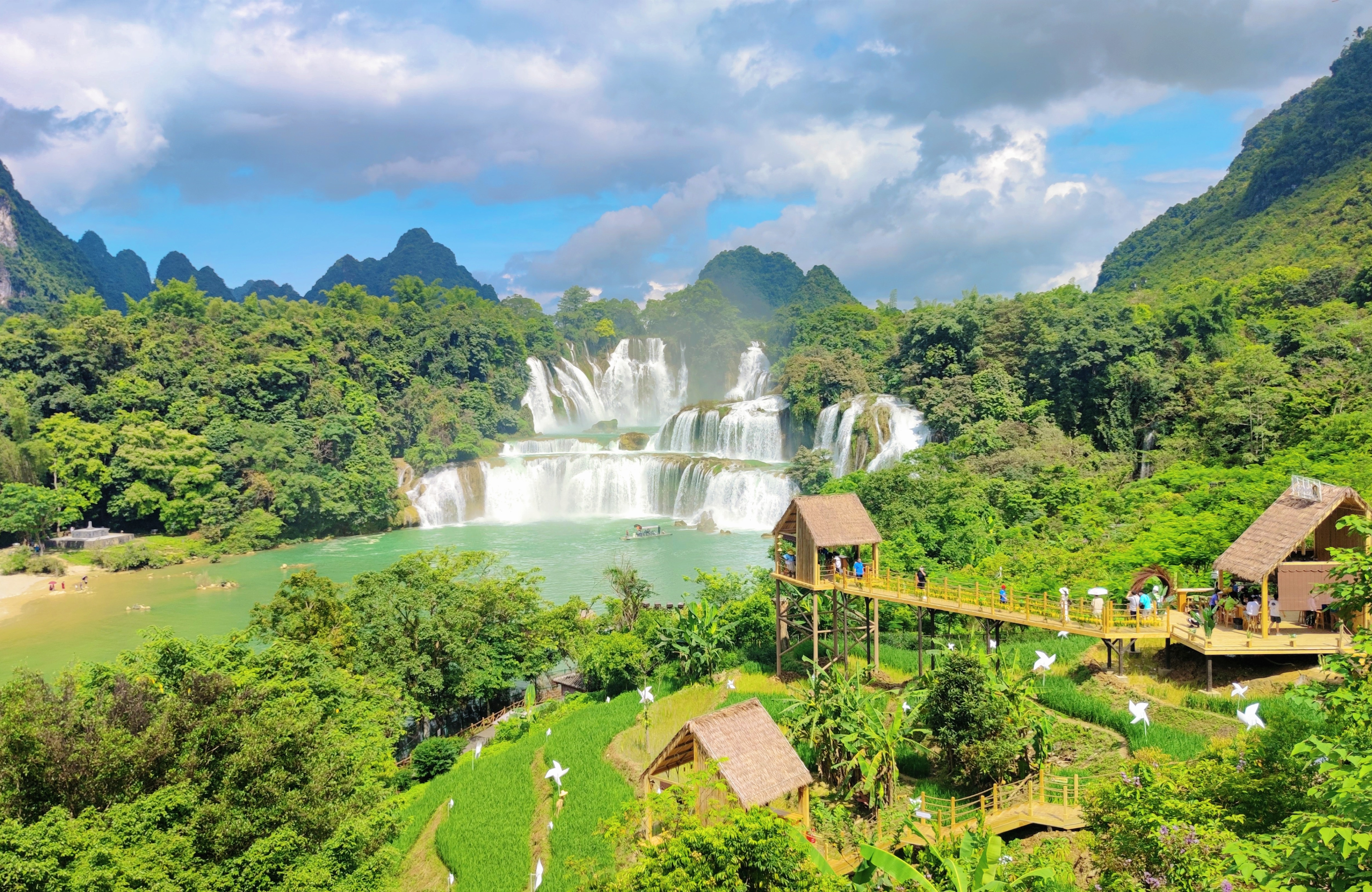 德天跨國(guó)瀑布景區(qū)位于廣西壯族自治區(qū)崇左市大新縣碩龍鎮(zhèn)德天村,地處中越邊境的百里山水畫廊之上。瀑布分三級(jí)跌落,橫跨中、越兩國(guó),與越南板約瀑布相鄰,寬200多米,縱深60多米,落差高達(dá)70余米,層層跌落,水勢(shì)激蕩,氣勢(shì)磅礴,是亞洲第一大跨國(guó)瀑布。作為廣西邊關(guān)旅游的名片,德天跨國(guó)瀑布景區(qū)推出了奇妙·夜德天、中越跨境街、登高望“越”、飛天魔毯、懸崖玻璃棧道、高空滑道、觀瀑稻田咖啡時(shí)光集等特色項(xiàng)目,帶您水陸空360°解鎖邊關(guān)旅游新體驗(yàn)。